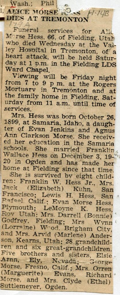 She is survived by eight children: Franklin W. Hess Jr., Mrs. Jack (Elizabeth) Kuhn, San Francisco; Lewis H. Hess, San Rafael, Calif.; Evan Morse Hess, Plymouth; LeMoyne K. Hess, Roy Utah; Mrs. Darrell (Bonnie) Godfrey, Fielding; Mrs. Wynn (Lorraine) Wood, Brigham City, and Mrs. Arvid (Marlene) Anderson, Kearns, Utah; 28 grandchildren and six great-grandchildren. Five brothers and sisters, Elsie Arnn, Ely, Nevada; George Morse, Fresno, Calif.; Mrs. Orren (Marguerite) Evans, Richard Morse, and Mrs. Clyde (Ethel) Suttlemeyer, Ogden.