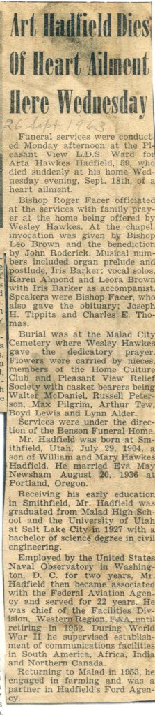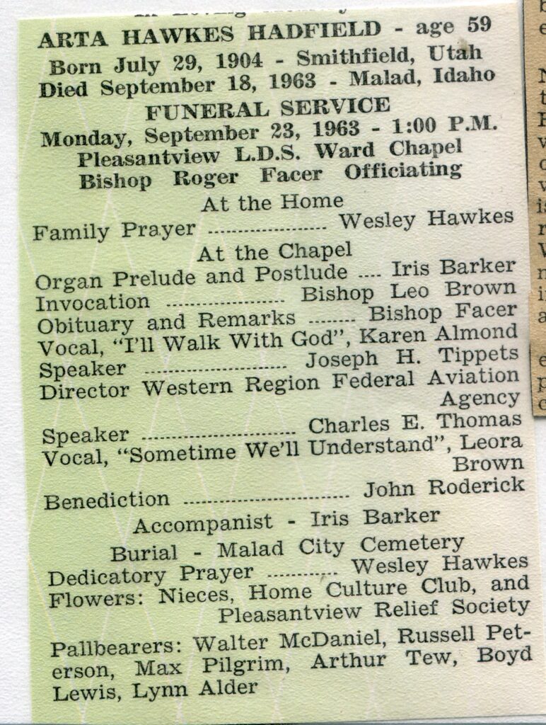 Funeral services were conducted Monday afternoon at the Pleasant View L.D.S. Ward for Arta Hawkes Hadfield, 59, who died suddenly at his home Wednesday evening, Sept. 18th, of a heart ailment.