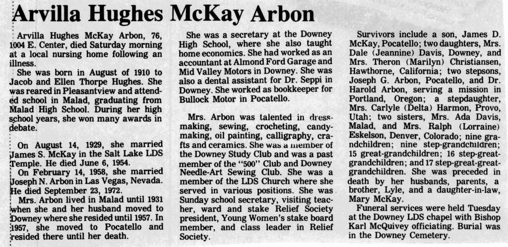 Survivors include a son, James D. McKay, Pocatello; two daughters, Mrs. Dale (Jeannine) Davis, Downey, and Mrs. Theron (Marilyn) Christiansen, Hawthorne, California; two stepsons, Joseph G. Arbon, Pocatello, and Dr. Harold Arbon, serving a mission in Portland, Oregon; a stepdaughter, Mrs. Carlyle (Delta) Harmon, Provo, Utah; two sisters, Mrs. Ada Davis Malad, and Mrs. Ralph (Lorraine) Eskelson, Denver, Colorado; nine grandchildren; nine step-grandchildren; 15 great-grandchildren; 16 step-great-grandchildren; and 17 step-great-great-grandchildren. She was preceded in death by her husbands, parents, a brother, Lyle, and a daughter-in-law, Mary McKay.