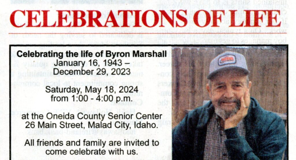 It is with great sadness and joy, that we announce that Byron J Marshall of Malad, Idaho has won his fight against Dementia and Alzheimer’s. Byron was born on a cold winter’s day on January 16, 1943, in Driggs, Idaho. He passed away December 29, 2023, at his daughter’s home in Covington, LA, St Tammany Parish.