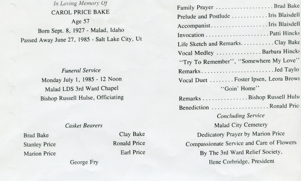 Carol Jean Price Bake, 57, of 38 West 90 South, Kaysville, Utah, and former Malad resident, died Thursday in the LDS Hospital in Salt Lake City (Death June 27, 1985).