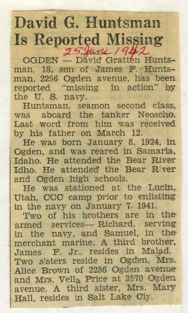 OGDEN- David Gratten Huntsman, 18, son of James F. Huntsman, 2257 Ogden avenue, has been reported “missing in action” by the U.S. Navy.