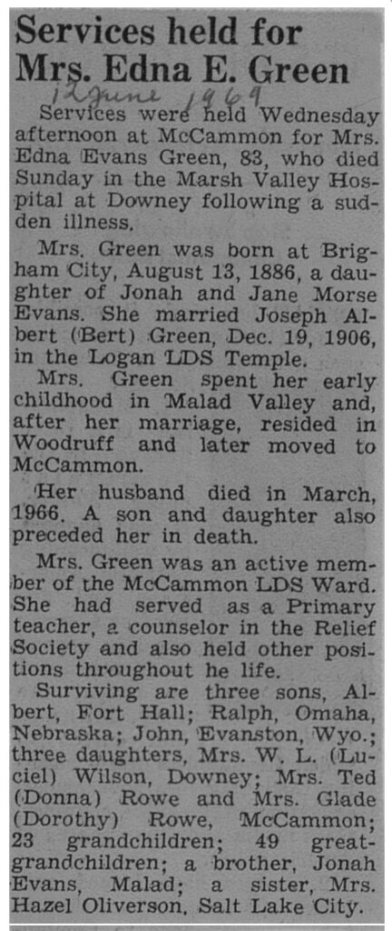 Mrs. Green was born at Brigham City, August 13, 1886, a daughter of Jonah and Jane Morse Evans. She married Joseph Albert (Bert) Green, December 19, 1906 in the Logan LDS Temple.