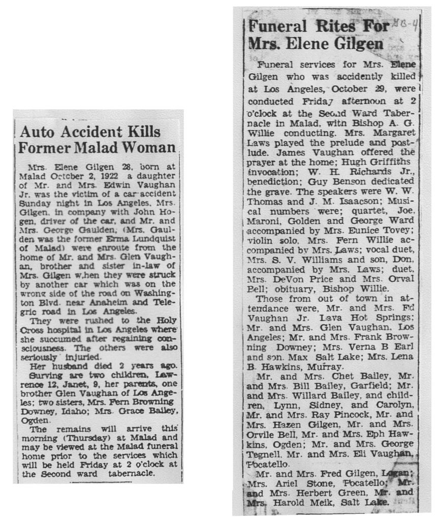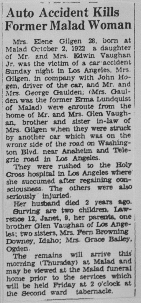 Mrs. Elene Gilgen, 28, born at Malad October 2, 1922, a daughter of mr. and Mrs. Edwain Vaughan Jr. was the victim of a car accident in Los Angeles. Mrs. Gilgen, in company with John Hogen, driver of the car, and Mr. and Mrs. George Gaulden, (Mrs. Gaulden was the former Erma Lundquist of Malad) were enroute from the home of Mr. and Mrs. Glen Vaugahn, brother and sister in-law of Mrs. Gilgen when they were struck by another car which was on the wrong side of the road on Washington Blvd., near Anaheim and Telegric Road in Los Angeles.