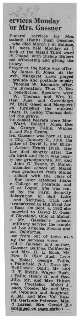 Funeral services for Mrs. Elizabeth (Beth) Bush Gassner, who died March 1, 1956 at Salinas, CA, were held at the Malad Third Ward LDS Chapel with Bishop Hubert Gleed officiating and giving the obituary.