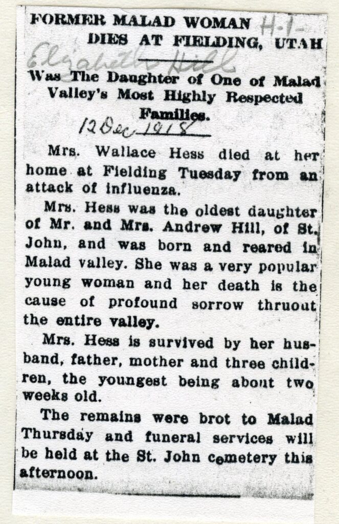 Mrs. Hess was the oldest daughter of Mr. and Mrs. Andrew Hill, of St. John, and was born and reared in Malad Valley. She was a very popular young woman and her death is the cause of profound sorrow thruout the entire valley.
