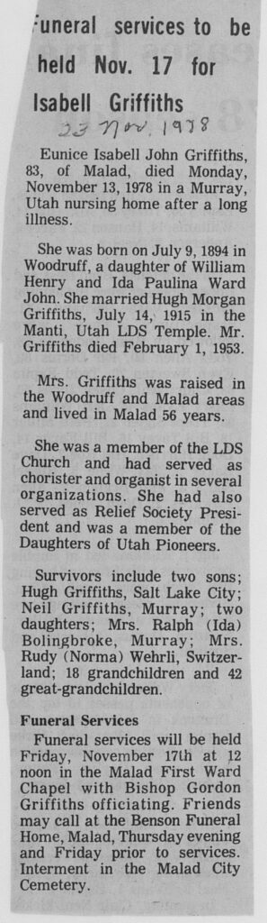 Eunice Isabell John Griffiths, 83, of Malad, died November 13, 1978 in a Murray, Utah nursing home after a long illness.