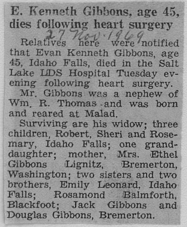 Relatives here were notified that Evan Kenneth Gibbons, age 45, Idaho Falls, died in the Salt Lake LDS Hospital Tuesday following heart surgery.