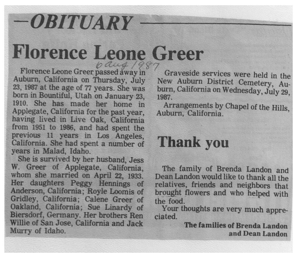 Florence Leone Greer passed away in Auburn, CA on July 23, 1987 at the age of 77 years. She was born in Bountiful, UT on January 23, 1910. She has made her home in Applegate, CA for the past year, having lived in Live Oak, CA from 1951 to 1986, and had spent the previous 11 years in Los Angeles, CA. She had spent a number of years in Malad, ID.