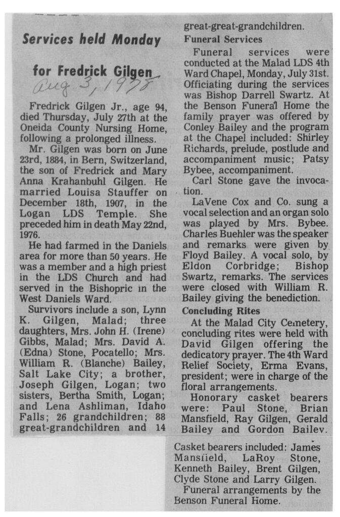 Survivors include a son, Lynn K. Gilgen, Malad; three daughters, Mrs. John H. (Irene) Gibbs, Malad; Mrs. David A. (Edna) Stone, Pocatello; Mrs. William R. (Blanche) Bailey, Salt lake City; a brother, Joseph Gilgen, Logan; two sisters, Bertha Smith, Logan; and Lena Ashliman, Idaho Falls; 26 grandchildren; 88 great grandchildren and 14 great-great grandchildren.