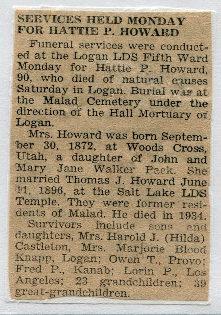 Funeral services were conducted at the Logan LDS Fifth Ward Monday for Hattie P. Howard, 90, who died of natural causes Saturday in Logan. Burial was at the Malad Cemetery under the direction of the Hall Mortuary of Logan.