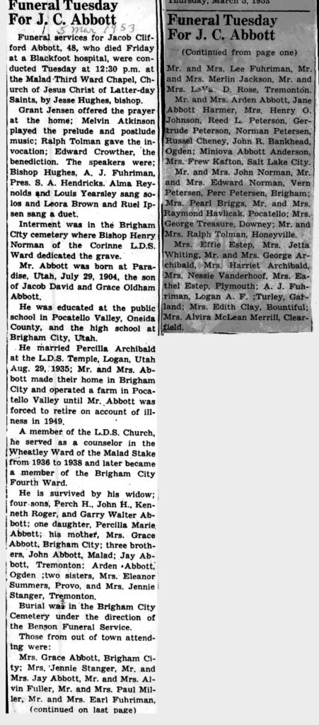 He married Percilla Archibald at the LDS Temple, Logan, Utah, Aug 29, 1935; Mr. and Mrs. Abbott made their home in Brigham City and operated a farm in Pocatello Valley until Mr. Abbott was forced to retire on account of illness in 1949.