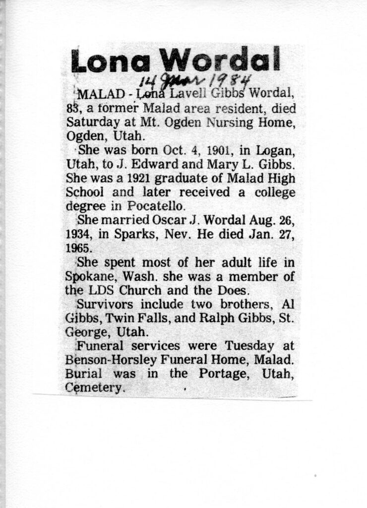Lona Lavell Gibbs Wordal, (1901)