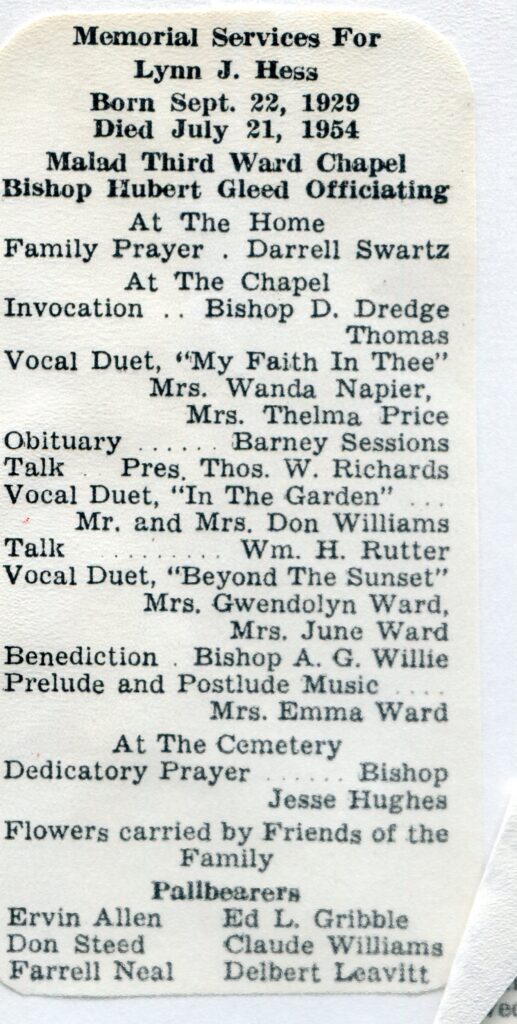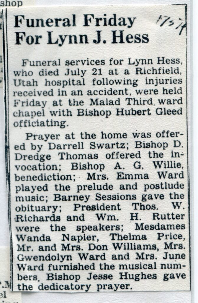 Funeral services for Lynn Hess, who died July 21 at a Richfield, Utah hospital following injuries received in an accident, were held Friday at the Malad Third ward chapel with Bishop Hubert Gleed officiating.