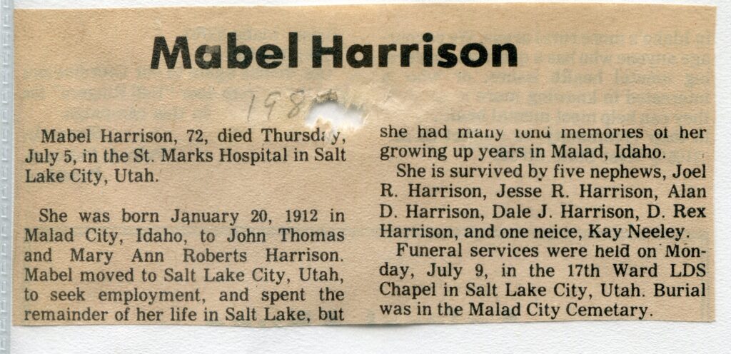 She was born January 20, 1912 in Malad City, Idaho, to John Thomas and Mary Ann Roberts Harrison. Mabel moved to Salt Lake City, Utah, to seek employment, and spent the remainder of her life in Salt Lake, but she had many fond memories of her growing up years in Malad, Idaho.