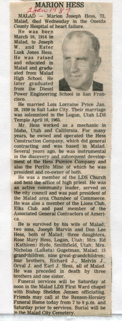 He is survived by his wife of Malad; two sons, Joseph Marvin and Don Lee Hess, both of Malad; three daughters, Rose Mary Hess. Logan, Utah; Mrs. Ed (Kathleen) Hyde, Smithfield, Utah; Mrs. Nicholas (LaReta) Gugelman, Malad; 15 grandchildren; nine great-grandchildren; four brothers, Richard J., Melvin J., Orval J. and Earl J. Hess, all of Malad! He was preceded in death by three brothers and one sister.