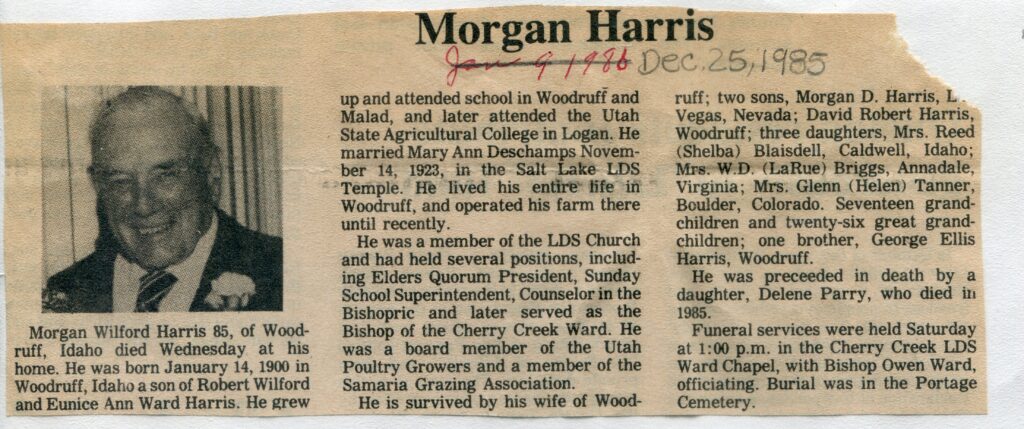 Morgan Wilford Harris 85, of Woodruff, Idaho died Wednesday at his home. He was born January 14, 1900 in Woodruff, Idaho a son of Robert Wilford and Eunice Ann Ward Harris. He grew up and attended school in Woodruff and Malad, and later attended the Utah State Agricultural College in Logan. He married Mary Ann Deschamps November 14, 1923, in the Salt Lake LDS Temple. He lived his entire life in Woodruff, and operated his farm there until recently.