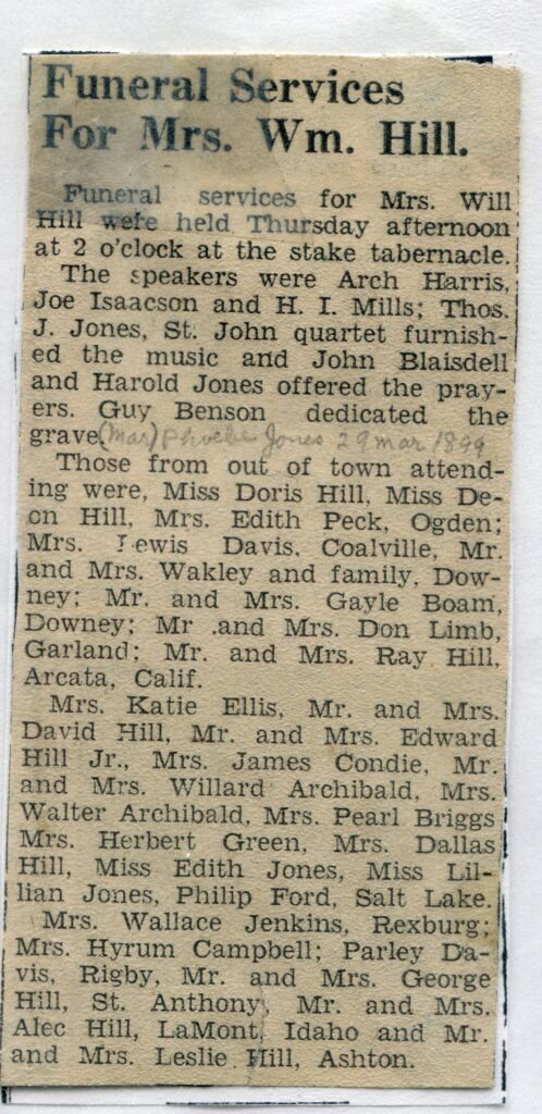 Funeral services for Mrs. William Hill were held Thursday afternoon at 2 o’clock at the stake tabernacle.