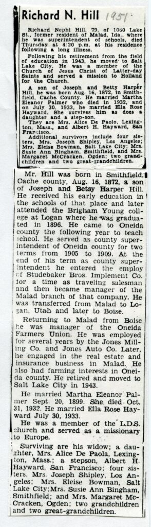 Richard Nephi Hill, 79, of 1060 Lake St., former resident of Malad, Ida., where he was superintendent of schools, died Thursday at 4:20 p.m. at his residence following a long illness.