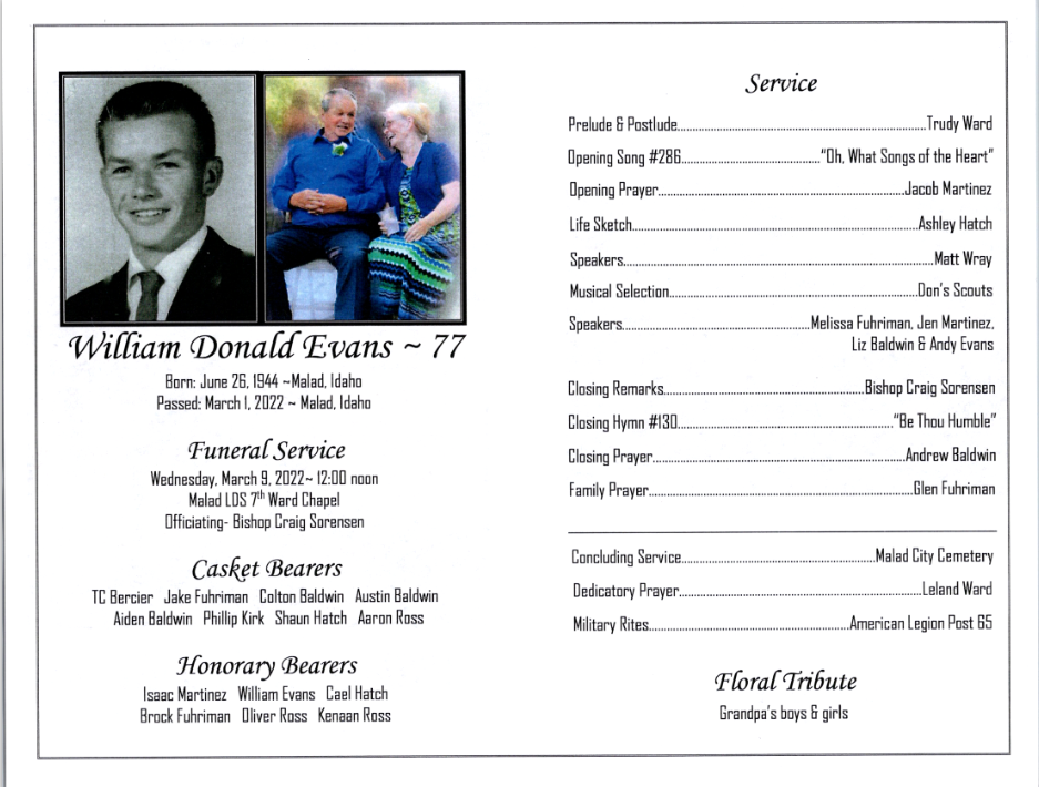 Don is survived by Chris, his wife and best friend of 51 years and their 4 children; Melissa (Glen) Fuhriman of Santaquin, UT, Jennifer (Jacob) Martinez of Clinton, UT, Elizabeth (Andrew) Baldwin of Blackfoot, ID, and Andrew (Christine) Evans of Wellington, CO; 14 grandchildren (4 spouses) and 7 great-grandchildren; a sister Nedra Preece and a brother Raymond Evans.