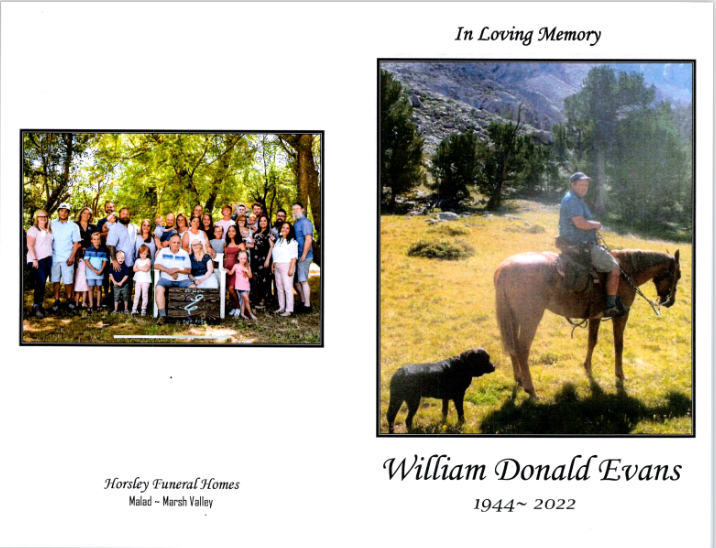 Don Evans, 77, of Malad, ID took his final earthly journey, this time leaving his pack at home. He was welcomed home by his best hiking buddy, Tank, his Father in Heaven, and many eagerly awaiting family members, on March 1, 2022. Don spent his final days surrounded by those he cherished, his best friend of 54 years always by his side.