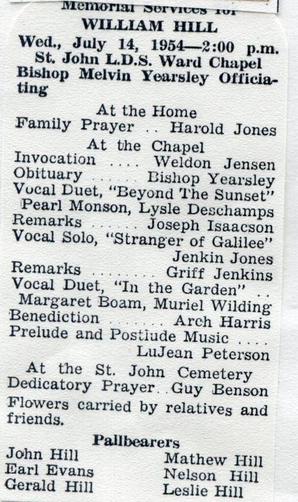 Harold Jones offered the prayer at the home; Weldon Jensen, invocation; Arch Harris, benediction; Bishop Yearsley gave the obituary; LuJean Peterson played the prelude and postlude music. The speakers were J.M. Isaacson and Griff Jenkins. The musical numbers consisted of duet, Pearl Monson and Lysle Deschamps; solo, Jerkin Jones; vocal duet, Margaret Boam and Muriel Wilding. Guy Benson dedicated the grave.