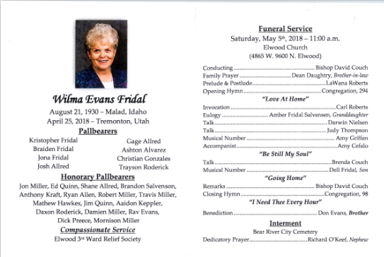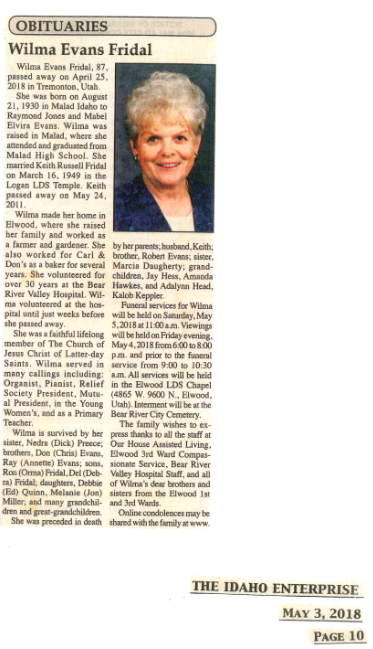 Wilma Evans Fridal, 87, passed away on April 25, 2018 in Tremonton, Utah. She was born on August 21, 1930 in Malad Idaho to Raymond Jones & Mabel Elvira Evans. Wilma was raised in Malad, where she attended and graduated from Malad High School. She married Keith Russell Fridal on March 16, 1949 in the Logan LDS Temple. Keith passed away on May 24, 2011.