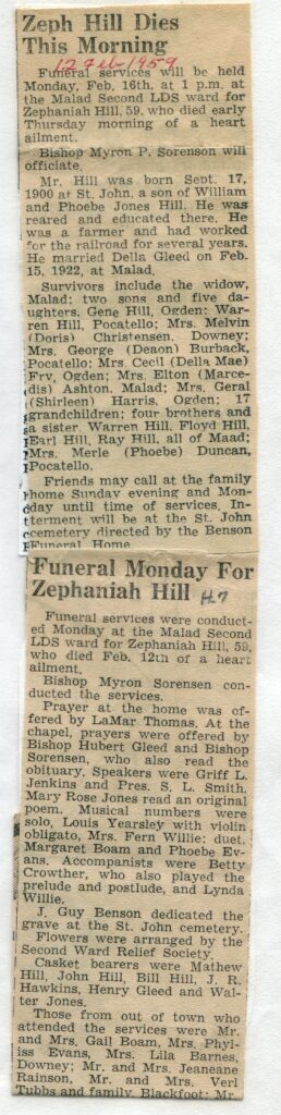 Funeral services were conducted Monday at the Malad Second LDS ward for Zephaniah Hill, 59, who died Feb. 12th of a heart ailment.